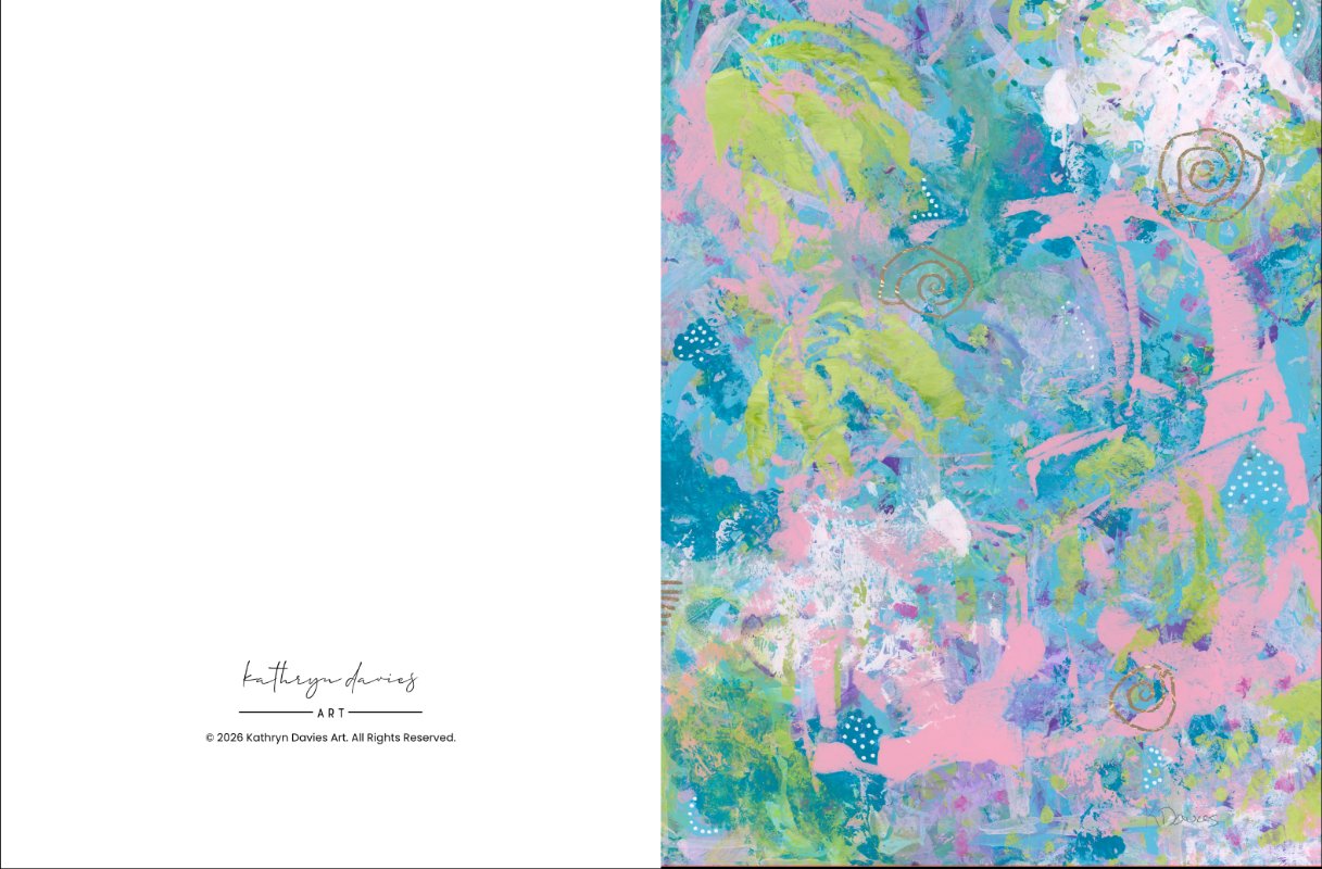 This blank greeting card features the original artwork Tropical Daydream by Kathryn Davies. With its rich colors and expressive texture, it makes a beautiful and heartfelt way to connect with someone special — for any occasion or no occasion at all.